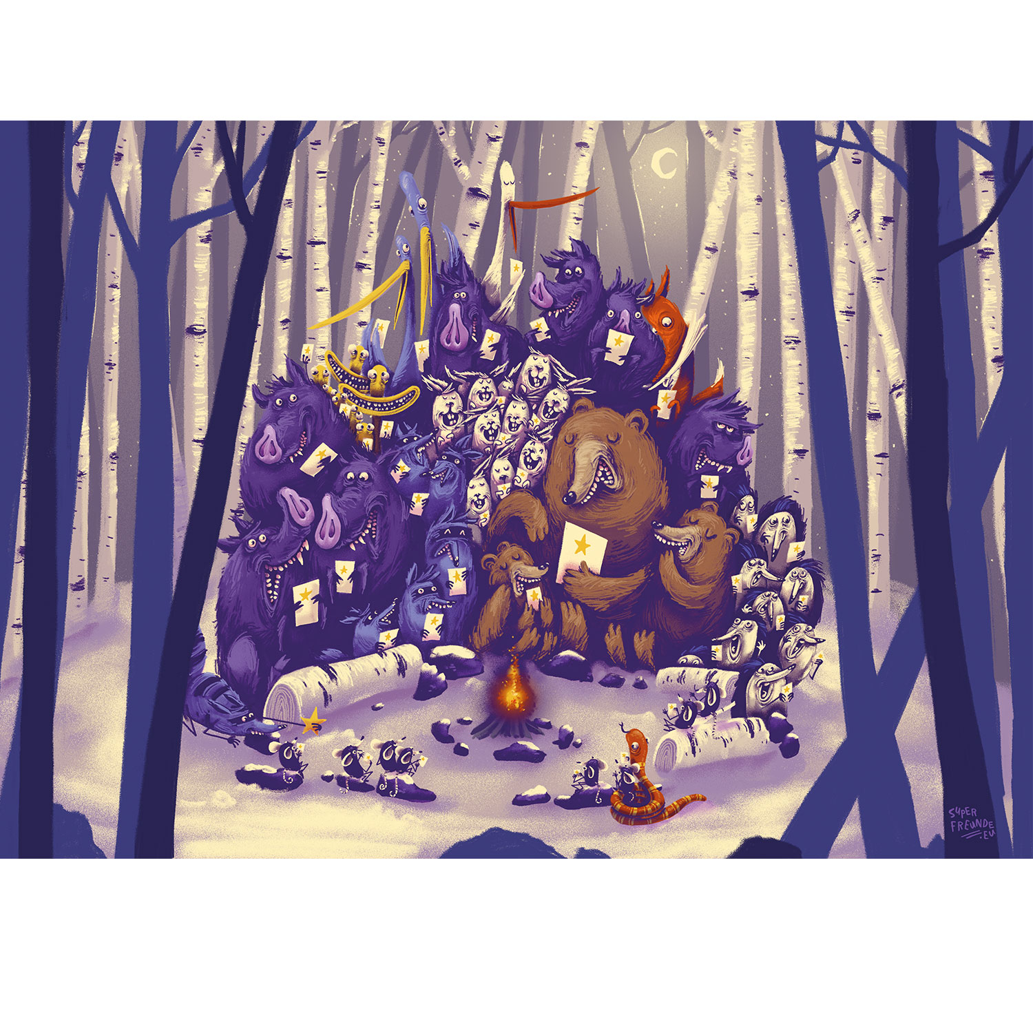 Gemeinsam singen am Lagerfeuer, ist nicht nur was für uns Menschen. Begleite die Tiere des Waldes bis sich alle an der feuerstelle versammelt haben und ein Liedchen anstimmen.Mit dem Superfreunde Adventskalender in 24 Tagen zum Fest. Dieser Kalender kommt ganz ohne Süßkram aus. Am Ende der Weihnachtszeit verbreitet er auch noch als Plakat eine schöne Stimmung!